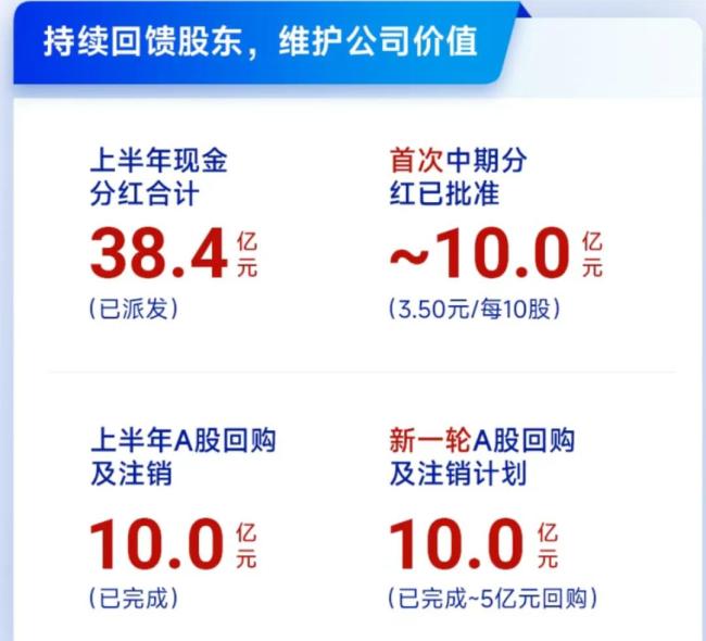 上半年内,28.35亿的2024年年度分红、10.11亿的特别分红、10亿的第二期股份回购均已实施完毕,规模同为10亿的第一期股份回购正在实施中,现已完成其中约5亿。