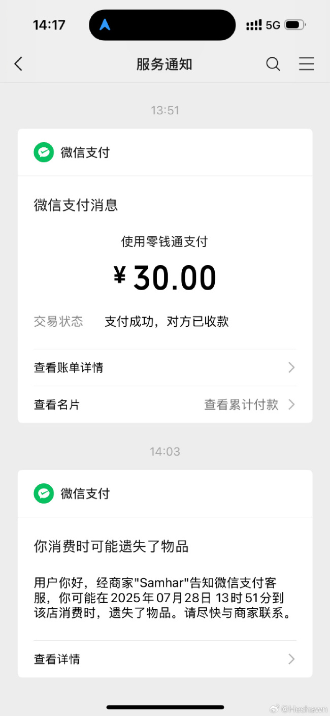 微信支付太牛了。在街边吃羊肉串,结束之后开车出去5公里,收到商家提醒说我丢东西了。