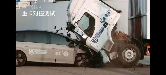发布会上,理想播放了一段体现车辆安全性的测试视频:i8以100公里/小时的速度,与一辆重卡正面、侧面相撞,i8的A柱、B柱、C柱、门梁等均未变形,车内安全气囊全部打开,电池包无漏液、无起火,车门自动解锁、门把手弹开。