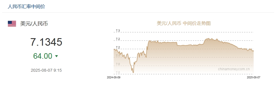 中新网8月7日电 据中国外汇交易中心网站消息,中国人民银行授权中国外汇交易中心公布,2025年8月7日银行间外汇市场人民币汇率中间价为:1美元对人民币7.1345元。