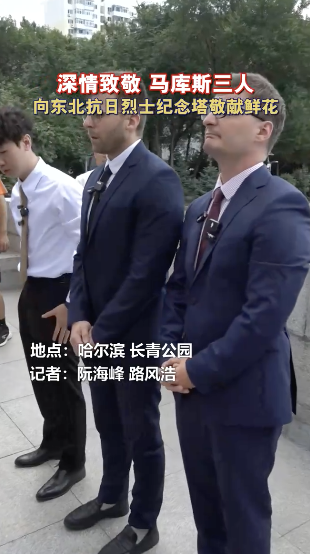 马库斯向抗日烈士纪念塔献花。8月7日,马库斯与士杰、钟灏松一参观侵华日军第731部队罪证陈列馆,在陈列馆目睹活体解剖、细菌实验等罪证后全程眉头紧锁、多次哽咽。士杰为医生参与暴行落泪:“医生职业不是用来做这些的!”三人坦言需心理治疗,称“虽看过照片,实物冲击远超预期”。8月8日,马库斯三人将前往哈尔滨长青公园,向东北抗日暨爱国自卫战争烈士纪念塔敬献鲜花,当天下午三人将前往北京,开启此次中国行的第二站。