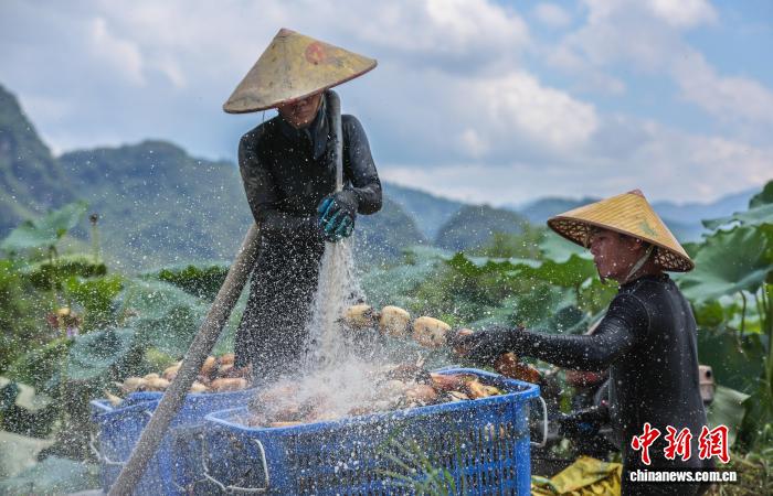 8月9日,在广西贺州市平桂区沙田镇马峰村,藕农正在采收莲藕。黎豪图 摄