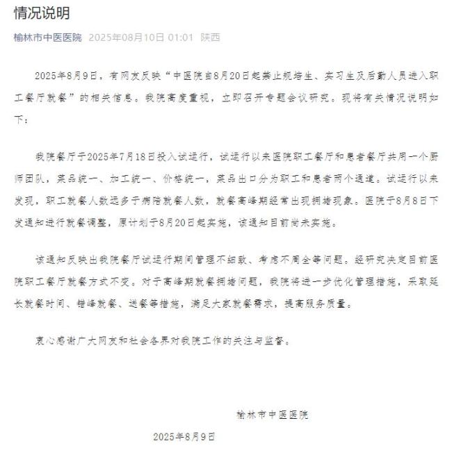 8月9日,陕西榆林市中医医院就网友反映的“中医院自8月20日起禁止规培生、实习生及后勤人员进入职工餐厅就餐”的情况进行了说明。医院表示高度重视,并立即召开专题会议研究。