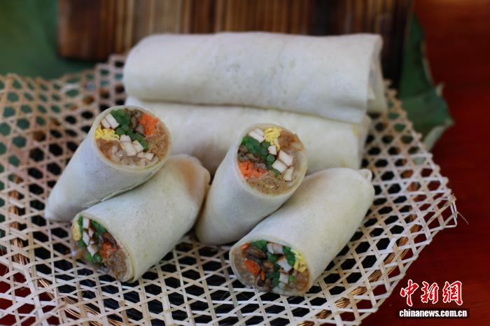 作为第三代大陈籍台胞,谢濬哲从长辈的言行中耳濡目染:“小时候过节,我们会把饼皮平铺在桌面上,均匀地加上虾仁炒笋丝、豆芽炒韭菜、酸菜炒米粉、墨鱼炒芹菜、五花肉丝、煎蛋丝等10多种馅料,这是大陈人招待亲友最豪华、最具故乡味的菜色,一直延续到现在。”