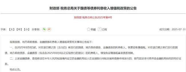 7月31日,财政部、税务总局联合发文表示,自2025年8月8日起(含当日)新发行的国债、地方政府债券、金融债券的利息收入,恢复征收增值税。对在该日期之前已发行的国债、地方政府债券、金融债券(包含在2025年8月8日之后续发行的部分)的利息收入,继续免征增值税直至债券到期。