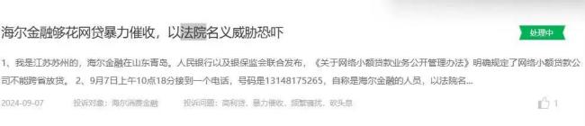 有消费者投诉称,自称是海尔消金的人员,以法院名义威胁消费者“恶意拖欠”。