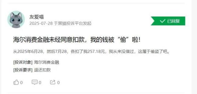鳌头财经发现,类似莫名被扣费的投诉并非个例。一位消费者称,从来没在海尔消金借过款,2025年6月28日、7月28日,被海尔消金分别扣了257.18元。