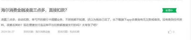 收费方面,海尔消金被投诉在不知情的情况下收取会员费、提前还款手续费等。