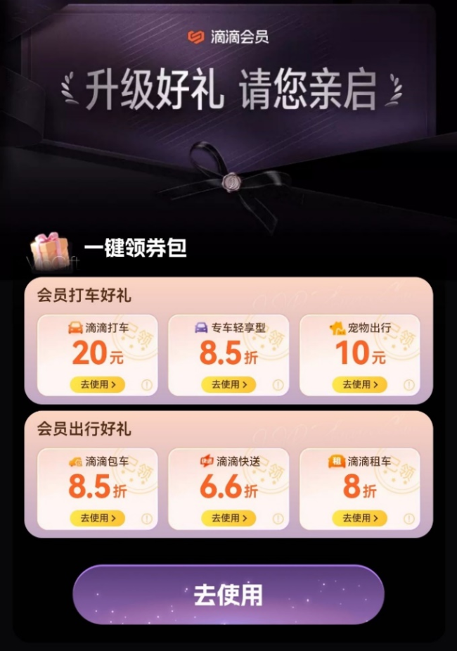 滴滴会员上线升级好礼,周周可领“惊喜券包”
