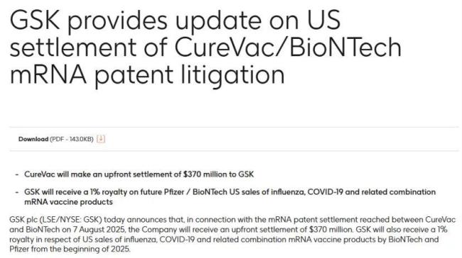 专利纠纷和解!GSK分羹3.7亿美元,辉瑞/BioNTech认栽买单?
