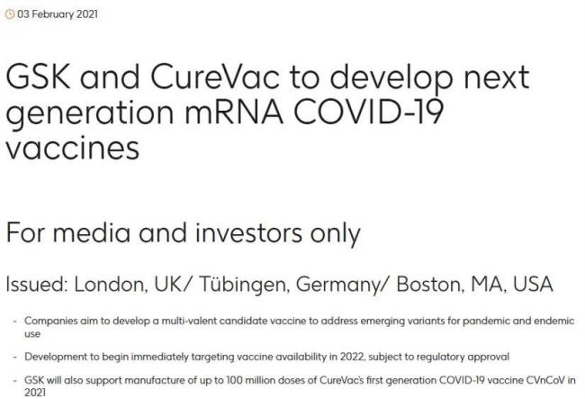 2021年2月,GSK和CureVac宣布新增一项1.5亿欧元的合作,共同开发下一代mRNA疫苗。该疫苗将具有多价方法的潜力,以解决一种疫苗中的多种新兴变体。彼时,GSK还计划在2021年支持生产多达1亿剂CureVac的CVnCoV,但最终也因有效率问题而搁浅。