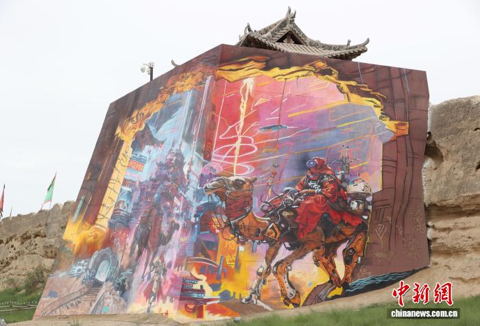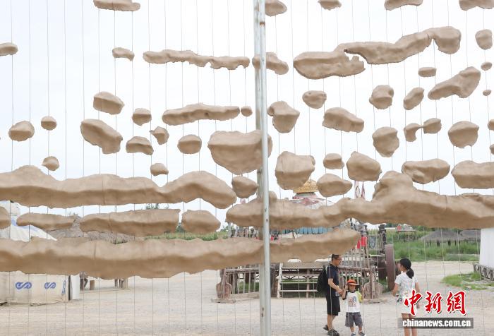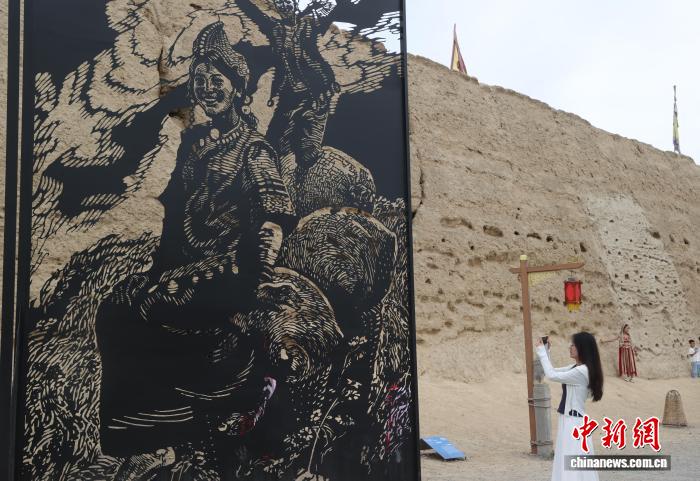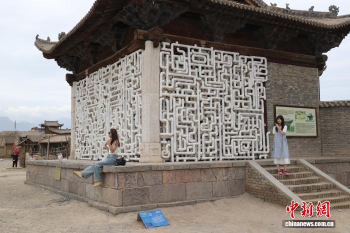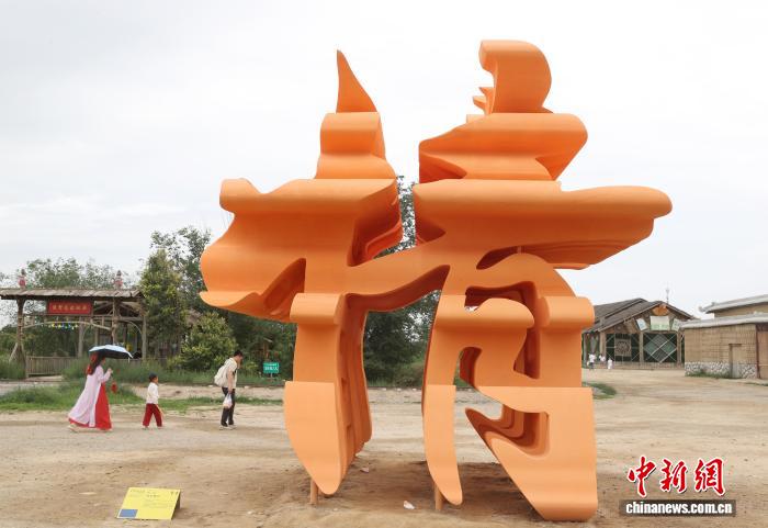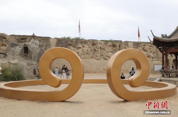 8月13日,宁夏银川,游客在镇北堡西部影视城参展的艺术作品前拍照打卡。中新社记者 于晶 摄