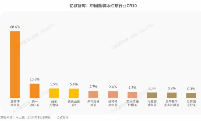 与此同时,市场格局发生细微变化。多年以来,有糖茶市场一直由康师傅、统一及农夫山泉三分天下,但近两年市场集中度微降,2023年至2024年,CR3由73.38%降至72.67%。
