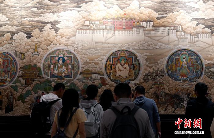 8月5日,游客参观西藏博物馆内展出的唐卡。中新社记者 李林 摄