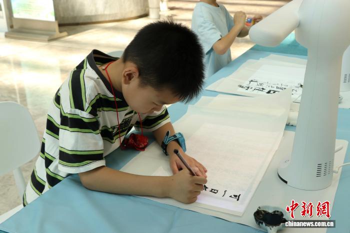 参加晒书会活动的小朋友正在体验书法。 熊锦阳 摄
