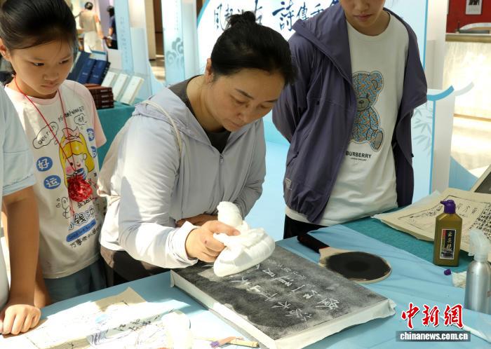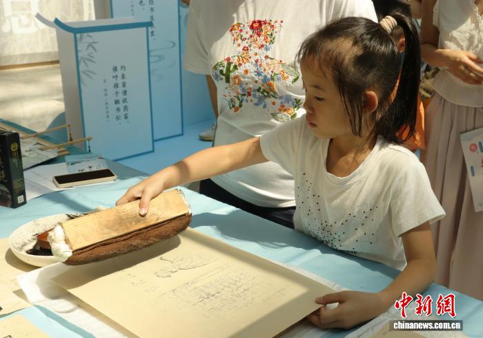 参加晒书会活动的小朋友正在体验雕版印刷。 熊锦阳 摄