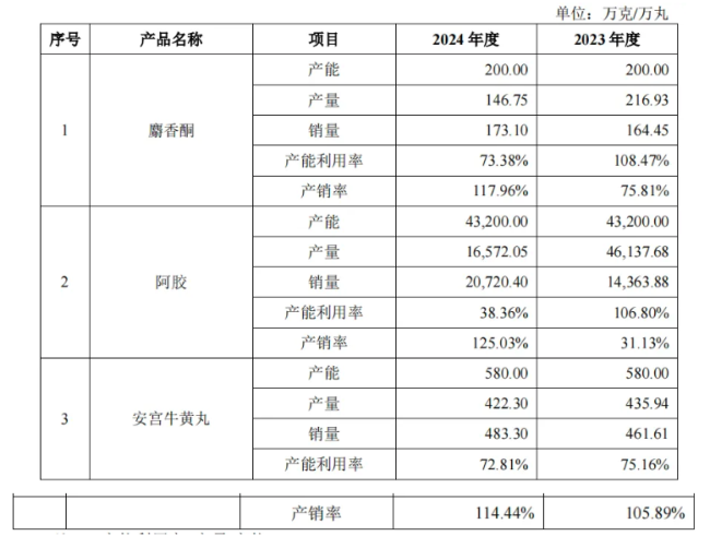 进一步观察发现,2024年,宏济堂的麝香酮、阿胶、安宫牛黄丸等核心产品的产能利用率分别为73.38%、38.36%、72.81%。一旦市场需求没有显著改善或者竞争加剧,现有产能闲置可能进一步扩大。
