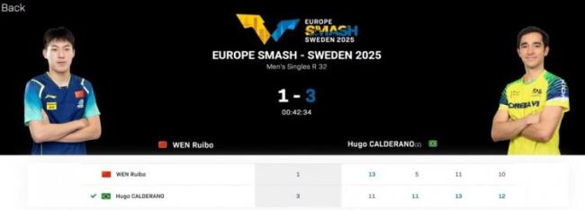 在WTT欧洲大满贯瑞典站男单比赛中,温瑞博以1-3不敌雨果-卡尔德拉诺,止步32强。具体比分为13-11、5-11、11-13、10-12。