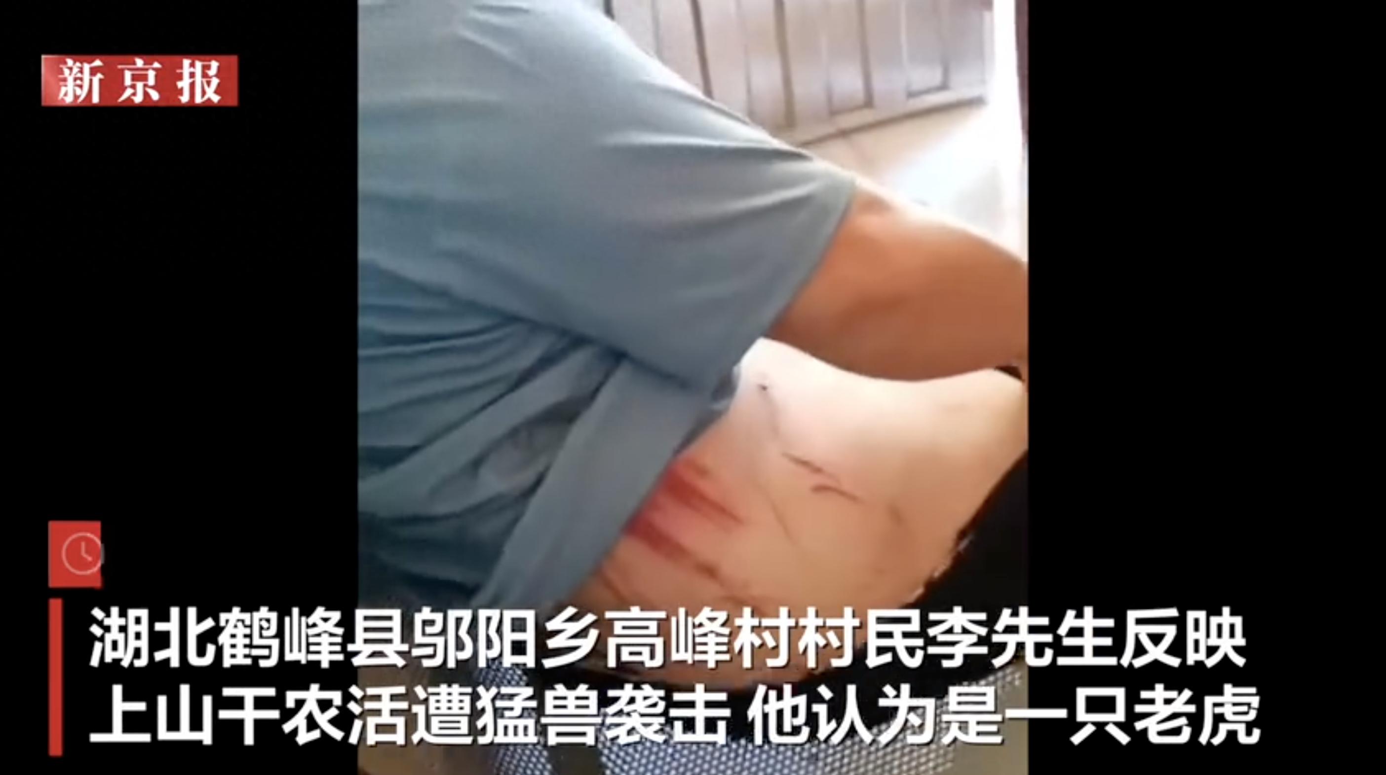 林业局推测村民或遭豹子袭击。8月19日,湖北鹤峰县邬阳乡高峰村村民李先生反映,17日上午他在山上干农活时,突遭一只老虎袭击,背部、腰部受伤,衣物被撕烂。