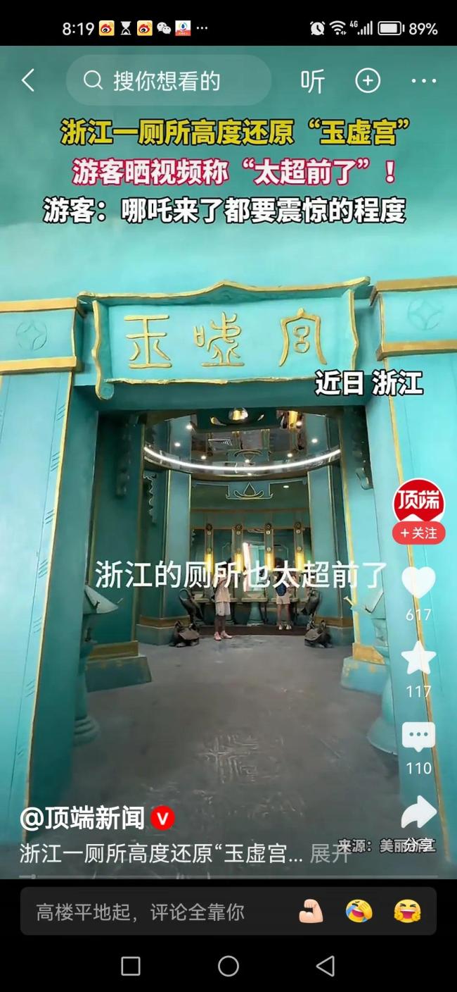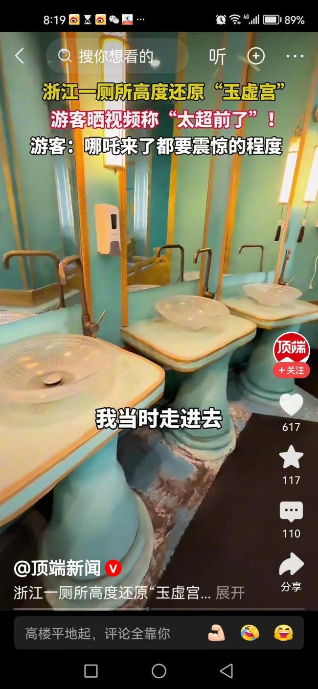 浙江一厕所高度还原玉虚宫引惊叹。浙江湖州某景区最近把厕所玩出了新高度——直接照着“玉虚宫”复刻了一座古建筑!飞檐翘角翘得快上天,青瓦红柱配俩石狮子守门,朱漆大门挂着铜环,门楣雕着云纹仙鹤,连洗手台都像汉白玉的,天花板还是古建筑藻井样式,活脱脱从神话剧里搬出来的仙宫。游客急着找厕所,远远瞅见这建筑,还以为是新开放的网红景点,绕着转了三圈才发现:哦豁,是厕所!有人洗手时对着镜子差点鞠躬,发圈调侃“这是隐藏款玉虚宫,就是功能主打一个接地气”。