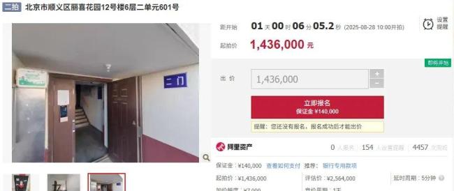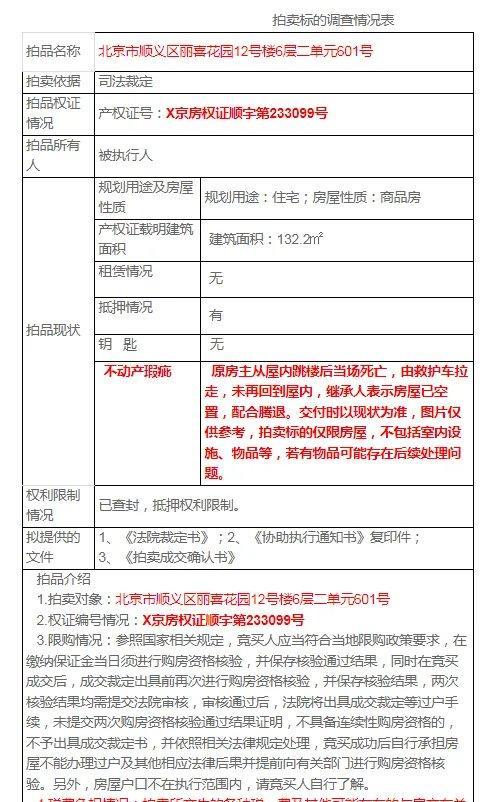 “死亡备注”法拍房二次拍卖,起拍价为143.6万元,近万人围观,1人报名参拍 凶宅阴影难散!北京顺义区丽喜花园12号楼6层二单元601号商品房曾发生过原房主跳楼身亡的悲剧。这套132.2平方米的房子如今以143.6万元的价格进行第二次拍卖,比评估价256.4万元低了近45%,但依然无人问津。