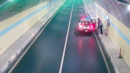 现场监控视频显示,驾驶员停车后,将多个锥形桶放在车辆后方,然后和同行女子沿着隧道入口往回走,直到民警赶到,将其安全带离。