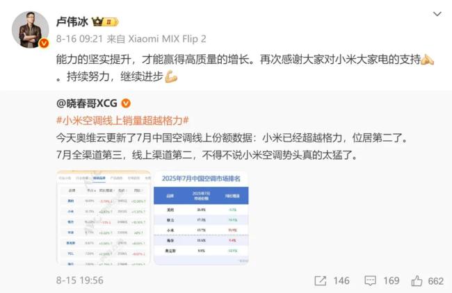 8月16日一早,小米的卢伟冰转发了一条博主@晓春哥XCG的微博,微博内容是一条奥维云网的截图,数据显示,小米空调线上销量市占率首次超过格力,仅次于美的,位居第二,全渠道市场份额则排第三。