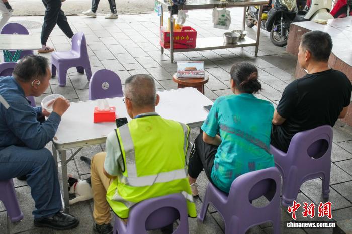 图为市民在一处早餐摊位通过平板电脑观看阅兵式直播。中新社记者 陈冠言 摄