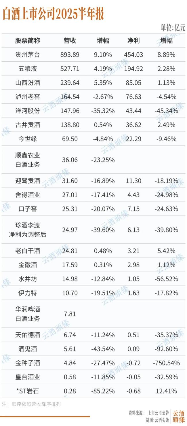 看行业:仍于低谷中国酒业协会数据显示,今年上半年,白酒产业产量191.59万千升,同比下降5.8%;销售收入3304.2亿元,同比微增0.19%;利润876.87亿元,比去年下降10.93%。云酒·中国酒业品牌研究院高级研究员、卓鹏战略创始人田卓鹏表示,大部分白酒企业处于业绩下行或持平状态,这符合行业整体发展趋势,也应辩证看待这一现象。对酒业而言,这并非不是一种利好——面对行业调整、政策干预带来的消费场景缩减,不少酒企已作出相应调整,摒弃一贯的“填鸭式”压货模式,为整个行业争取到缓冲空间。但其中的反映出的一些重要数据,也值得行业重视。一是利润下滑,59.7%的酒企营业利润减少,核心原因是高端消费受阻;二是库存增加,行业平均存货周转天数达900天,反映出主流渠道承压能力下降;三是现金流下行,表明渠道受阻、动销压力加大。云酒·中国酒业品牌研究院高级研究员、亮剑咨询董事长牛恩坤认为,2025年酒业依旧延续过往表现,呈现出营收利润增速放缓、分化加剧、渠道库存高压、价格倒挂等特征,其中保持4%以上增速的白酒企业只有贵州茅台、五粮液、山西汾酒、古井贡酒,反映了渠道高库存、消费需求萎缩和行业信心不足。“2025年上半年,行业面临着社会经济、相关政策、行业周期与消费环境等诸多挑战。”云酒·中国酒业品牌研究院高级研究员、知趣咨询总经理蔡学飞表示,半年报数据显示白酒行业整体承压态势明显,行业依然面临深度调整。这种调整突出表现为:量价齐跌,高端酒批价倒挂严重,库存周转天数持续高位,多数企业面临价格与渠道多重压力;消费结构剧变,政务及商务宴请需求锐减,婚宴和家庭自饮成主力场景,消费价格带向100-300元大众价格带下沉;行业集中度进一步提升,头部效应强化,头部企业占据营收和利润垄断性优势,中小酒企普遍业绩腰斩;电商、即时零售等新模式不断涌现,冲击传统经销渠道;消费者理性回归,对于产品功能之外的品牌文化与场景体验需要不断提高。云酒·中国酒业品牌研究院高级研究员、谏策咨询总经理刘圣松认为,2025年的酒企半年报基本与行业深度调整现状相印证。具体表现为头部酒企增长失速,利润出现下滑;二三线酒企投入增大,但业绩普遍不及预期,企业加速分化;部分问题企业加速下滑,表现堪忧。“十亿看企业规律,百亿看行业规律,千亿看经济规律,万亿看国家及世界规律。”千里智库创始人欧阳千里分析,按照这一逻辑,多数酒企业绩下滑恰恰是受到企业、行业发展周期的影响。只有茅台、五粮液两家企业的规模均在千亿以上,基本上跳出行业周期的影响,更多的是受经济周期的影响。云酒·中国酒业品牌研究院高级研究员、新零售专家鲍跃忠认为,2025年上市酒企的半年报不乏亮眼表现者,有一定代表性,但是还不能完整代表整个行业的实际,更不能影响对行业转型的思考和研究。