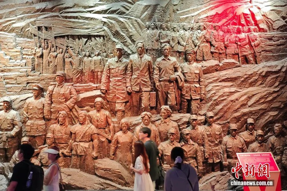 8月27日,江苏南京,观众在侵华日军南京大屠杀遇难同胞纪念馆“三个必胜”展厅内“正义必胜和平必胜人民必胜——中国战区反法西斯战争胜利暨审判日本战犯史实展”参观“众志成城全民族抗战”大型主题浮雕。中新社记者 泱波 摄