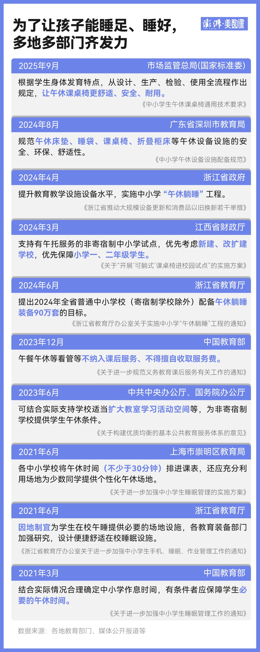 早在2021年,教育部就出台了“睡眠令”——《关于进一步加强中小学生睡眠管理工作的通知》。这份通知不仅明确了学生该睡够多久,还提到了有条件的地方和学校,要保障学生必要的午休时间。
