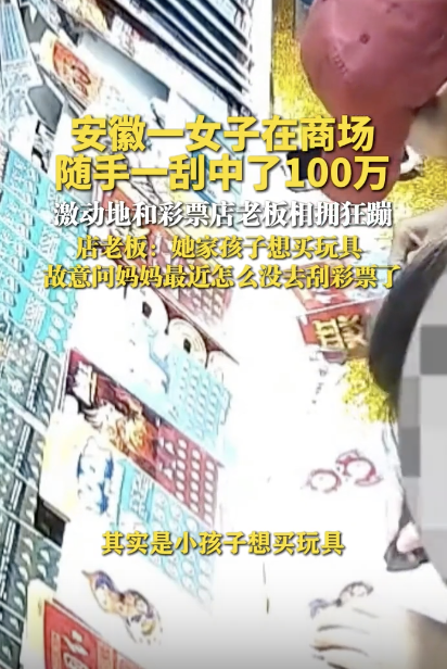 彩票店老板回应女子随手一刮中100万。9月8日发布,安徽芜湖。一女子在商场随手一刮中了100万,激动地和彩票店老板相拥狂蹦,店老板:她家孩子想买玩具,故意问妈妈最近怎么没去刮彩票了。
