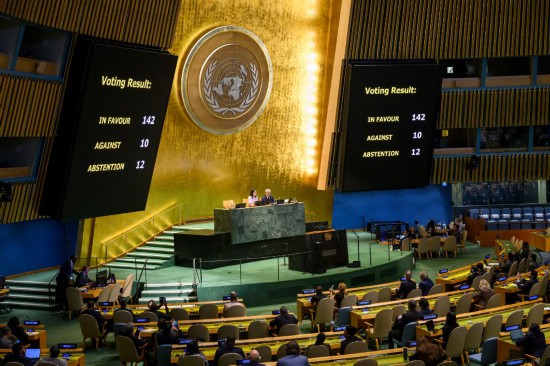 9月12日,联合国大会以142票赞成、10票反对、12票弃权的表决结果通过一项决议,支持关于和平解决巴勒斯坦问题及实施“两国方案”的纽约宣言。新华社发(联合国供图/洛伊·费利佩摄)