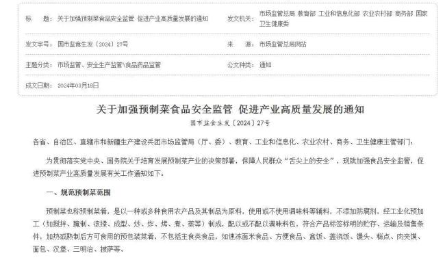 2024年3月,国家市场监管总局等六部门联合发布的《关于加强预制菜食品安全监管 促进产业高质量发展的通知》中明确,预制菜也称预制菜肴,是以一种或多种食用农产品及其制品为原料,使用或不使用调味料等辅料,不添加防腐剂,经工业化预加工(如搅拌、腌制、滚揉、成型、炒、炸、烤、煮、蒸等)制成,配以或不配以调味料包,符合产品标签标明的贮存、运输及销售条件,加热或熟制后方可食用的预包装菜肴,不包括主食类食品,如速冻面米食品、方便食品、盒饭、盖浇饭、馒头、糕点、肉夹馍、面包、汉堡、三明治、披萨等。