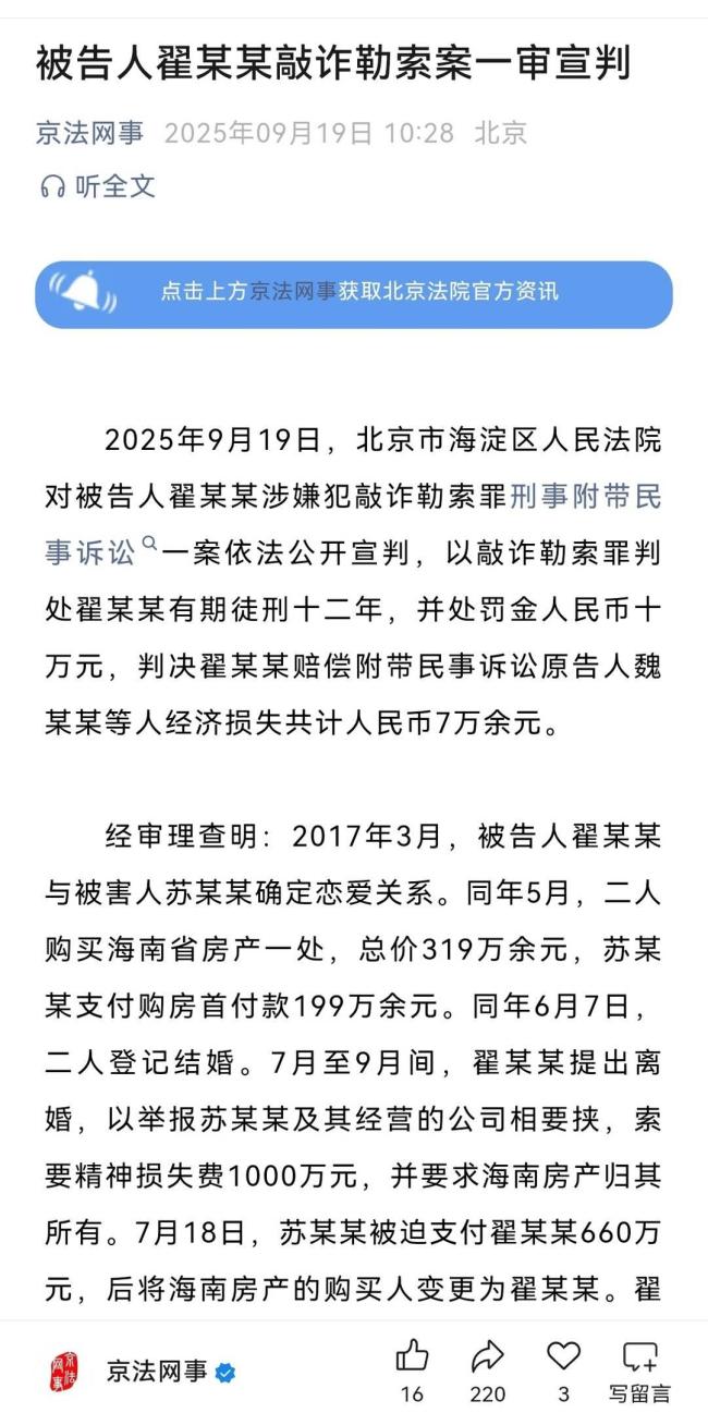 9月19日上午,北京市高级人民法院官方公众号通报,北京市海淀区人民法院对翟某某敲诈勒索案一审公开宣判。翟某某因敲诈勒索罪被判处有期徒刑十二年,并处罚金人民币十万元,还需赔偿附带民事诉讼原告人魏某某等人经济损失共计人民币7万余元。