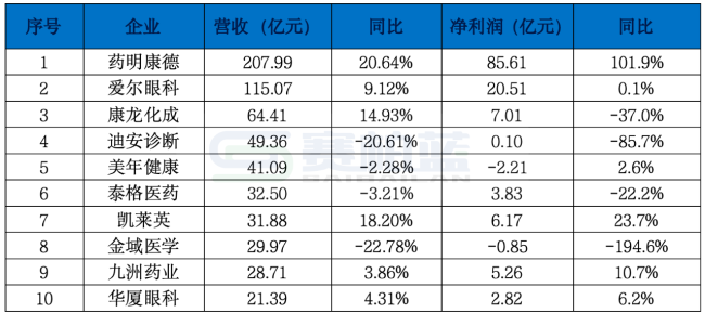 医疗服务行业前十企业的营收门槛超过20亿元,其中美年健康与金域医学两家企业出现净利润亏损。从细分行业看,CRO企业整体表现优于医疗诊断服务类企业。