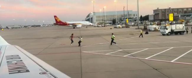 9月22日晚,一位北京网友发布视频称,在乘坐国航CA1107航班时,一名男子在停机坪上疑似闹事被机场警方控制。视频显示,这名男子在停机坪上奔跑,后面有警务人员追赶。尽管警方多次警告,该男子仍绕着飞机跑动,最终被四名民警控制并抬走。现场还有警车和两名疑似机场工作人员跟随。