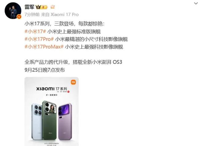 9月22日,小米董事长兼CEO雷军在社交平台宣布,小米17系列将于9月25日晚7点正式发布,共推出三款机型:小米17、小米17 Pro和小米17 Pro Max。雷军称,小米17是“小米史上最强标准版旗舰”,小米17 Pro是“小米最精湛的小尺寸科技影像旗舰”,小米17 Pro Max则是“小米史上最强科技影像旗舰”。新机全系搭载全新小米澎湃OS 3,产品力实现跨代升级。