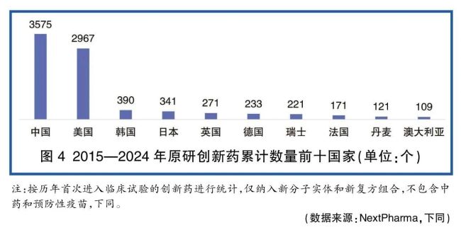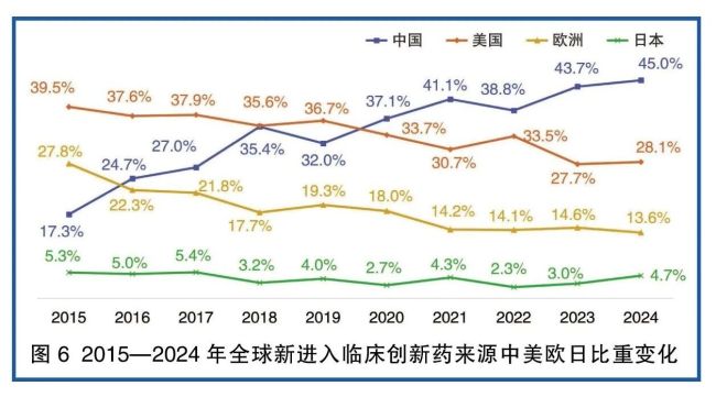 中国每年新进入临床的创新药数量迅速增长。2015年,中国首次开展临床试验的原研创新药数量为124款,低于美国(283款)与欧洲(199款)(详见图5)。2020年起,中国企业每年首次开展临床试验的原研创新药数量开始超过美国,2024年达到704款。当前,美国企业研发的创新药数量每年为400~500款,欧洲每年约有200款创新药进入临床,日本则在100款以下。