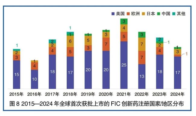 2015年,中国企业进入临床的FIC创新药只有9个,在全球的占比不足10%;2021年,中国进入临床的FIC创新药数量首次超过欧洲,位居全球第二;2024年,这一数字增加至120个,在全球的占比超过30%(详见图7)。