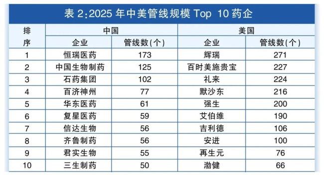 中国头部企业仍需继续追赶全球前排。对比中美两国管线规模前十企业,差距依旧十分显著。从全球排位看,2025年美国管线规模前十企业中,仅再生元与渤健未进入全球管线Top25药企之列,而国内上榜企业只有4家,其中百济神州为首次上榜。