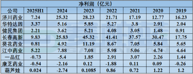部分儿科药上市公司净利润表现