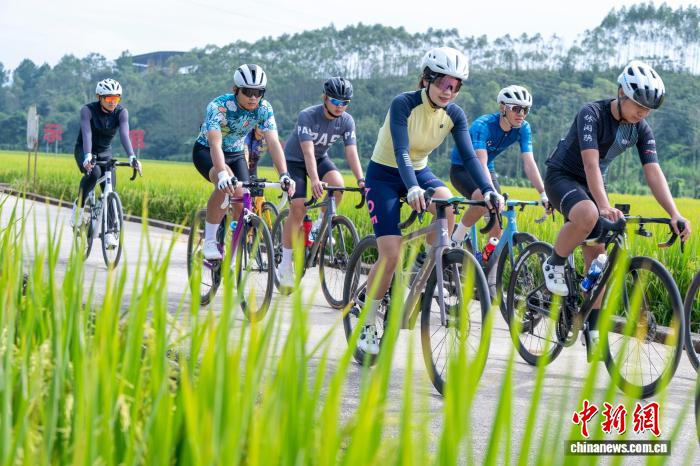 10月26日,广西梧州市龙圩区龙圩镇念村,骑行爱好者们穿梭于金黄的稻田小径,乐享深秋“丰”景。何华文 摄