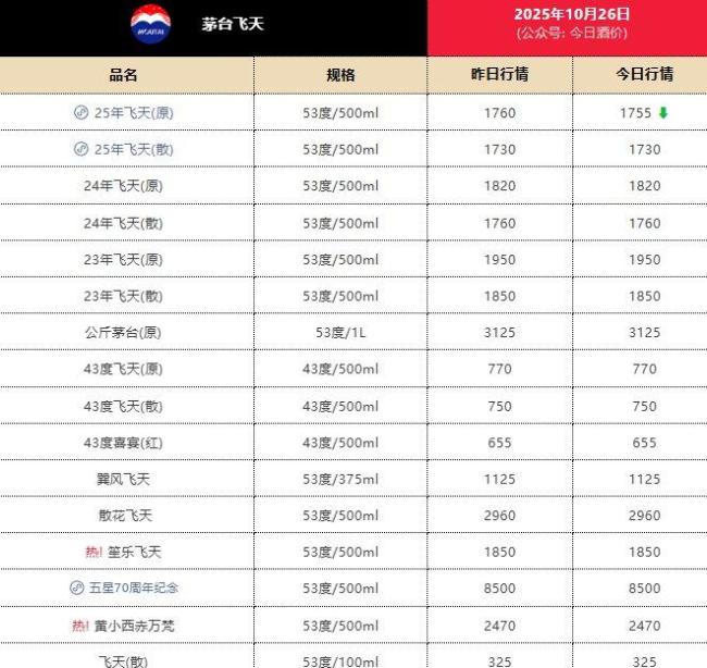 茅台价格继续下跌 市场行情波动!10月26日|今日酒价披露的批发参考价显示,10月26日,25年飞天茅台原箱较前一日下跌5元,报1755元/瓶;25年飞天茅台散瓶较前一日持平,报1730元/瓶。