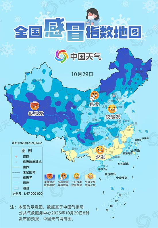 10月30日起,受冷空气影响,北方多地将迎明显降温,南方降水增多气温也将走低,易感冒区域有所扩大。不仅华北北部、西北地区、东北地区大部等地易引发感冒,江苏、上海、浙江的部分地区和湖南等地也将加入容易感冒的行列。长沙今天最高气温将降至17℃,再加上有雨水相伴,湿凉明显,易引发感冒。