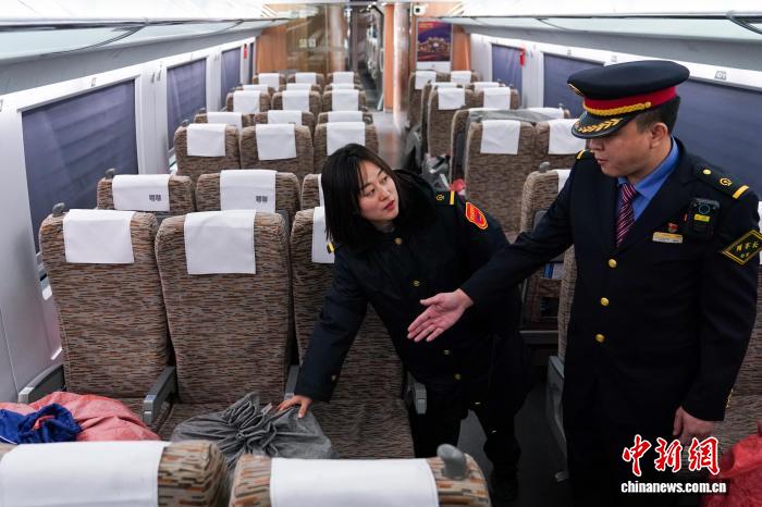 图为列车长与安全监督员检查高铁上的快件。中新社记者 赵宇航 摄