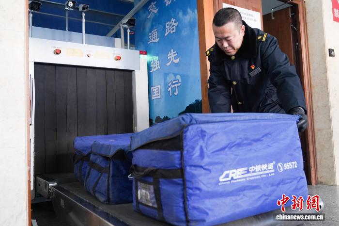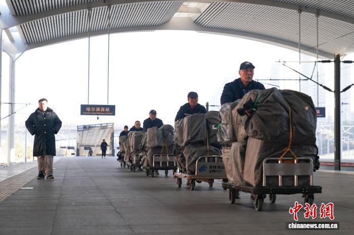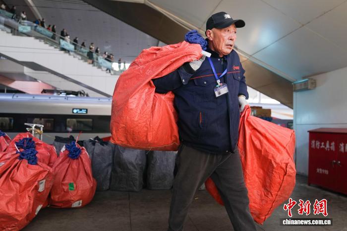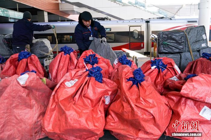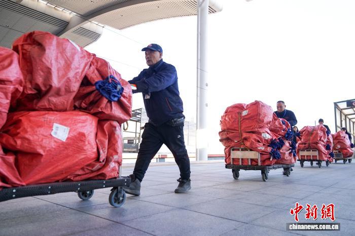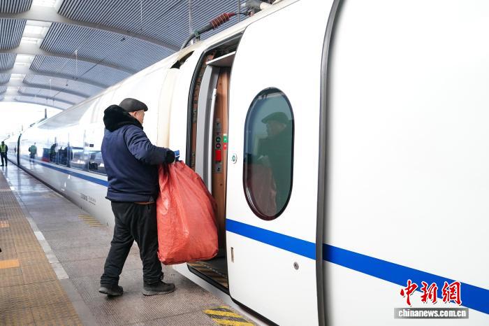图为工作人员将快件运输到高铁上。中新社记者 赵宇航 摄