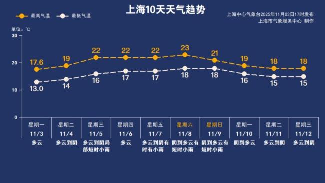 上海今天云系增多,以多云到阴为主,最低气温14℃,最高19℃,气温比昨日略有上升。建议注意补水润燥,并在早晚添衣保暖。