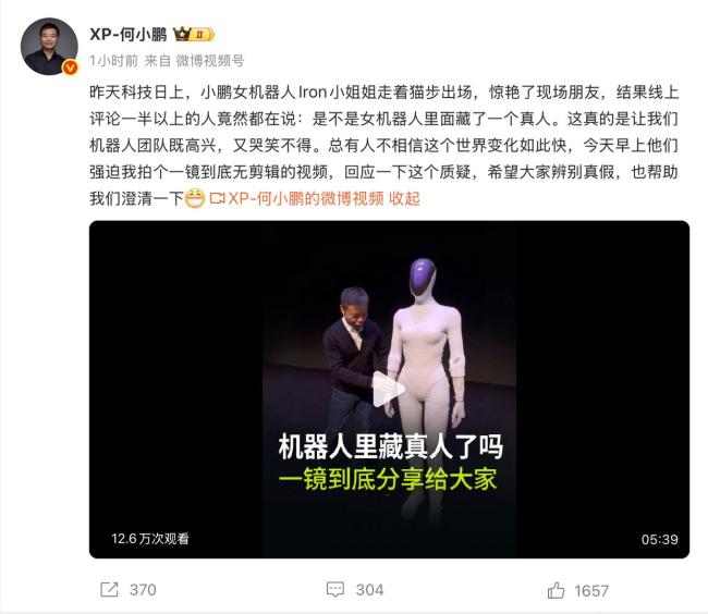 小鹏汽车董事长何小鹏对外界关于最新发布的人形机器人IRON藏有真人的质疑进行了回应。11月6日,他在社交媒体上表示,总有人不相信这个世界变化如此快,并通过一镜到底无剪辑的视频展示了机器人走猫步的全过程。视频中,何小鹏让团队拉开机器人背后的拉链,展示了其内部构造,包括背部晶格肌肉与控制器、肩膀的运输固定器、耳朵位置的麦克风阵列以及手部谐波关节等。