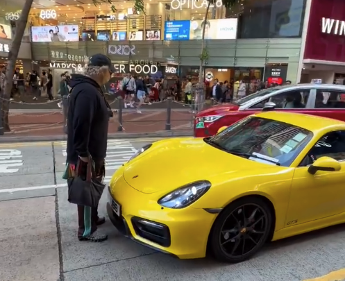 中国香港,一老外不走斑马线,被一辆保时捷碰了一下,然后老外堵在车前不让保时捷走。